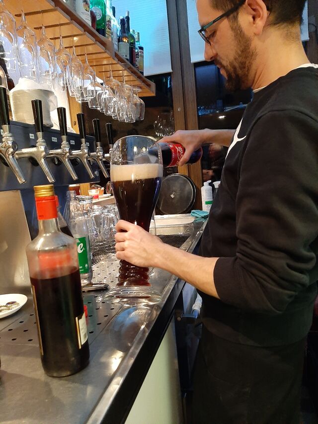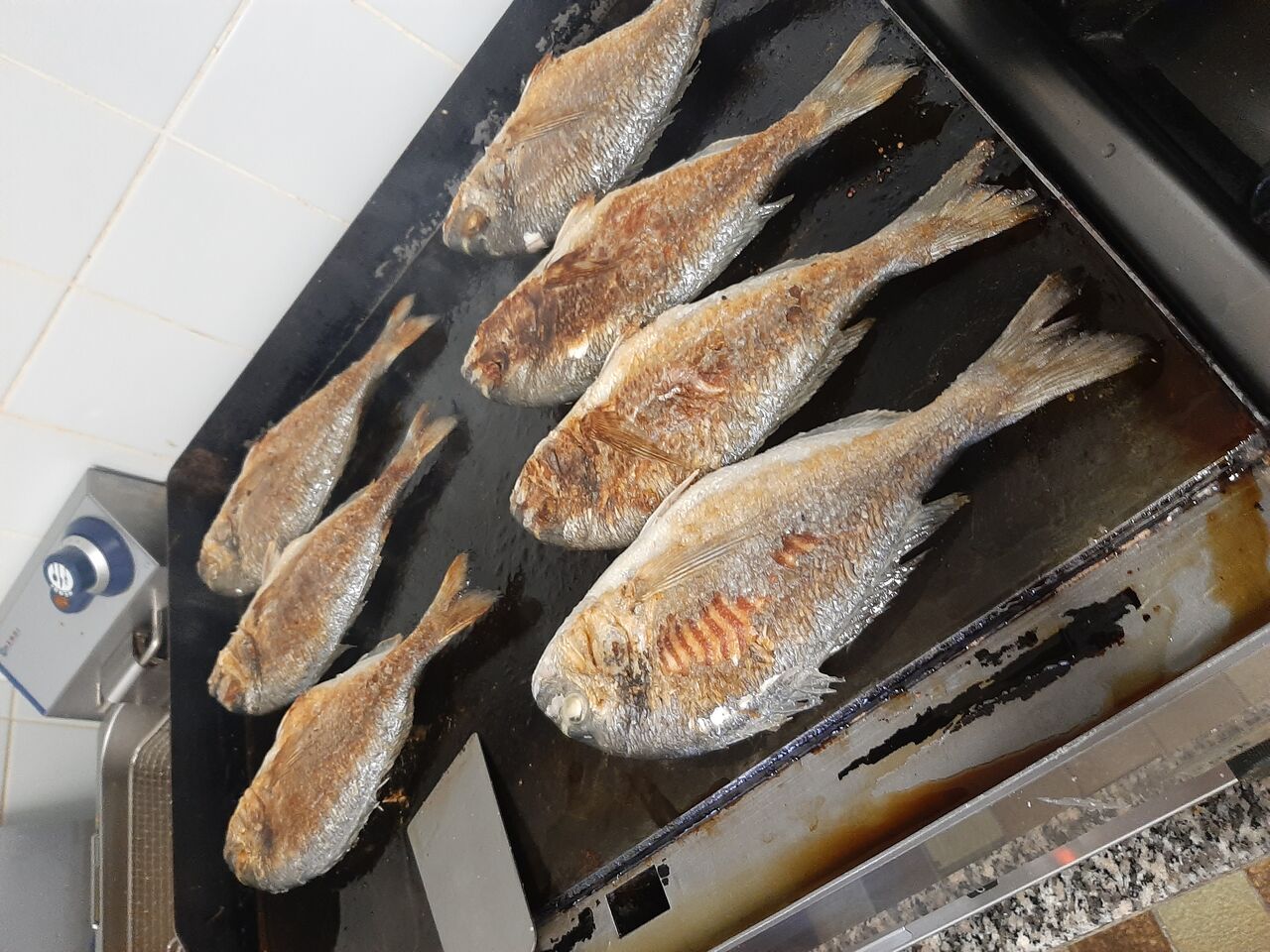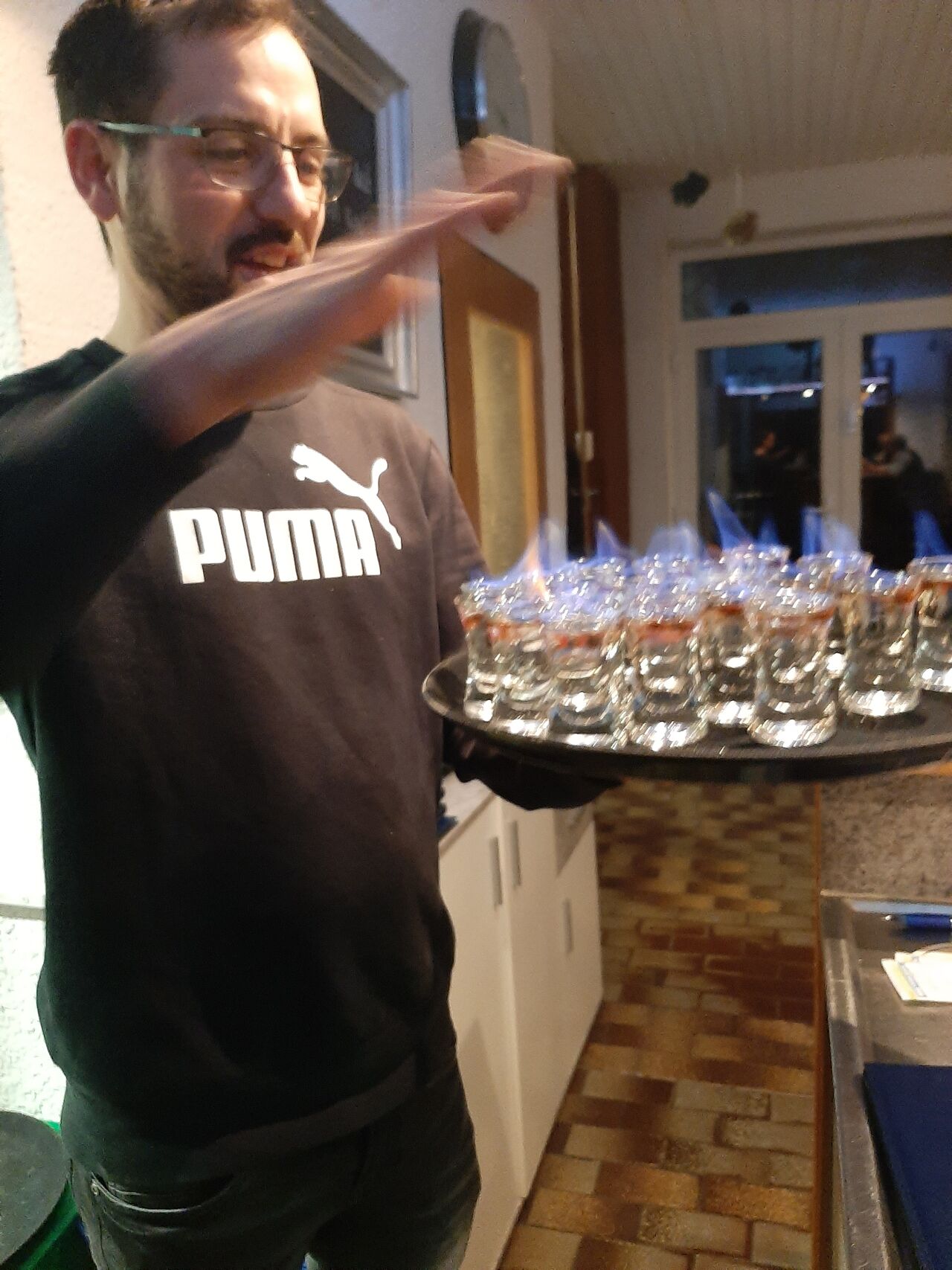 Portugiesisch Chouriza an Tisch gebraten mit Aguardente ( Portugiesisch Grappa )